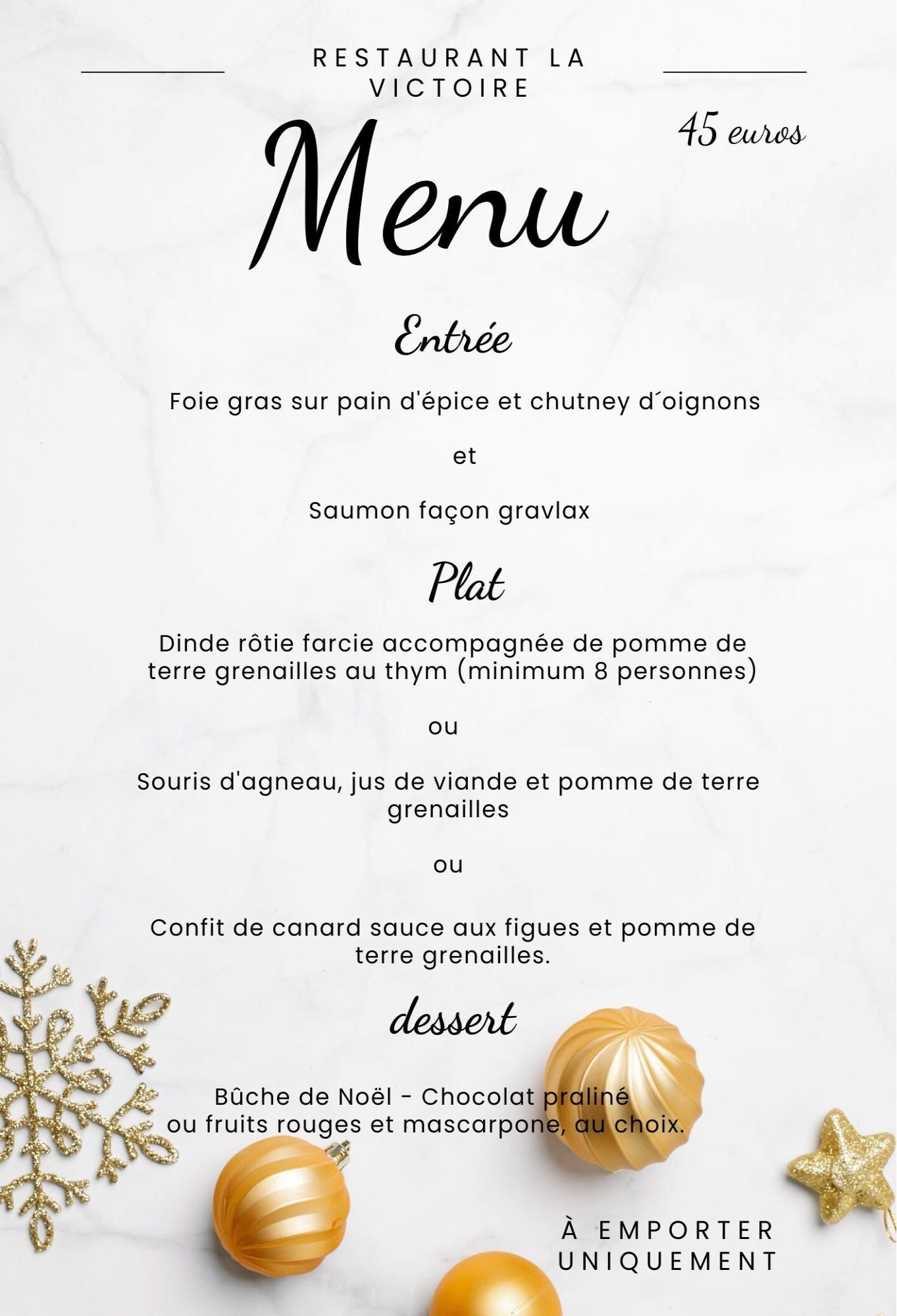 Menu de Noël à emporter sur réservation uniquement.